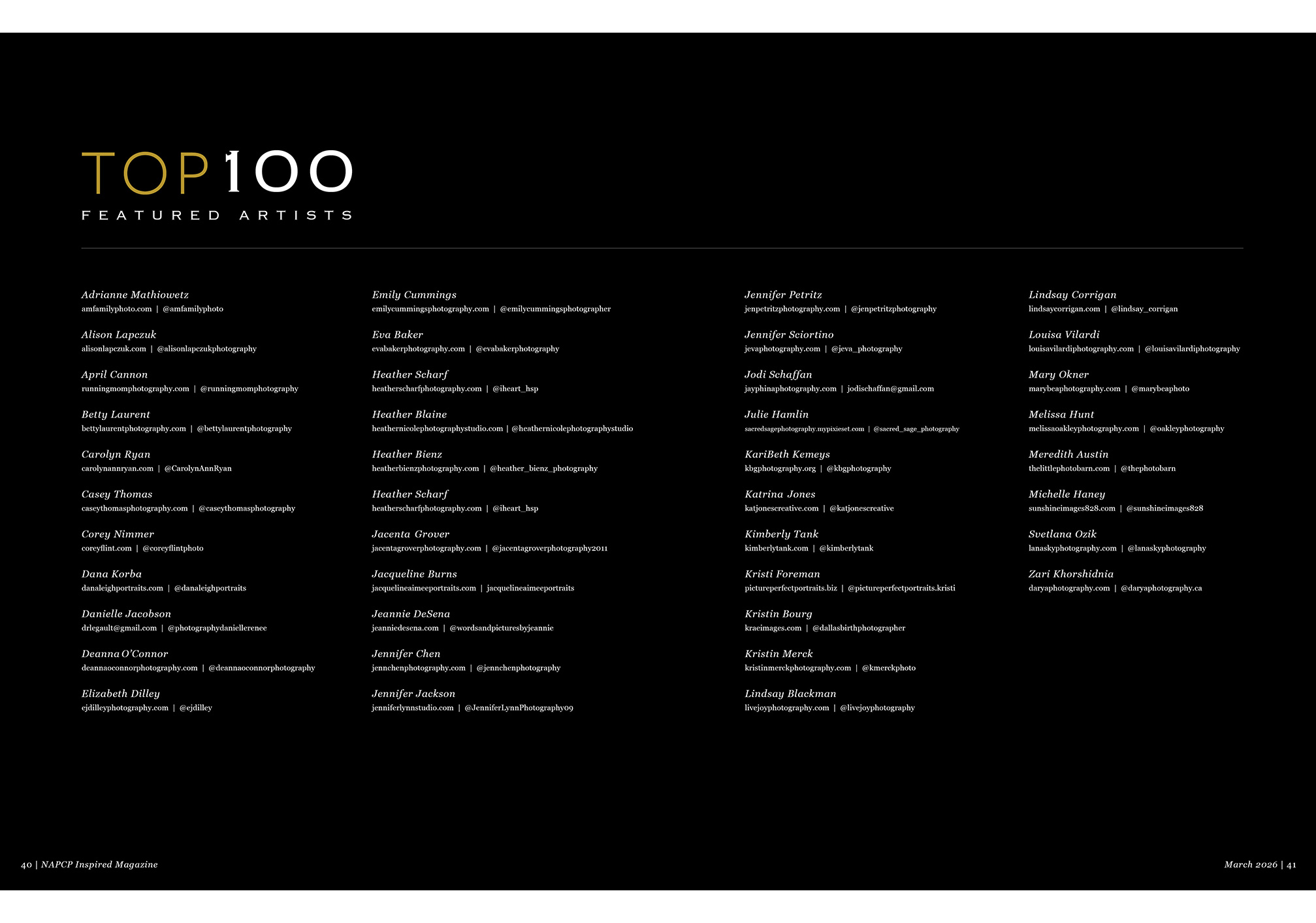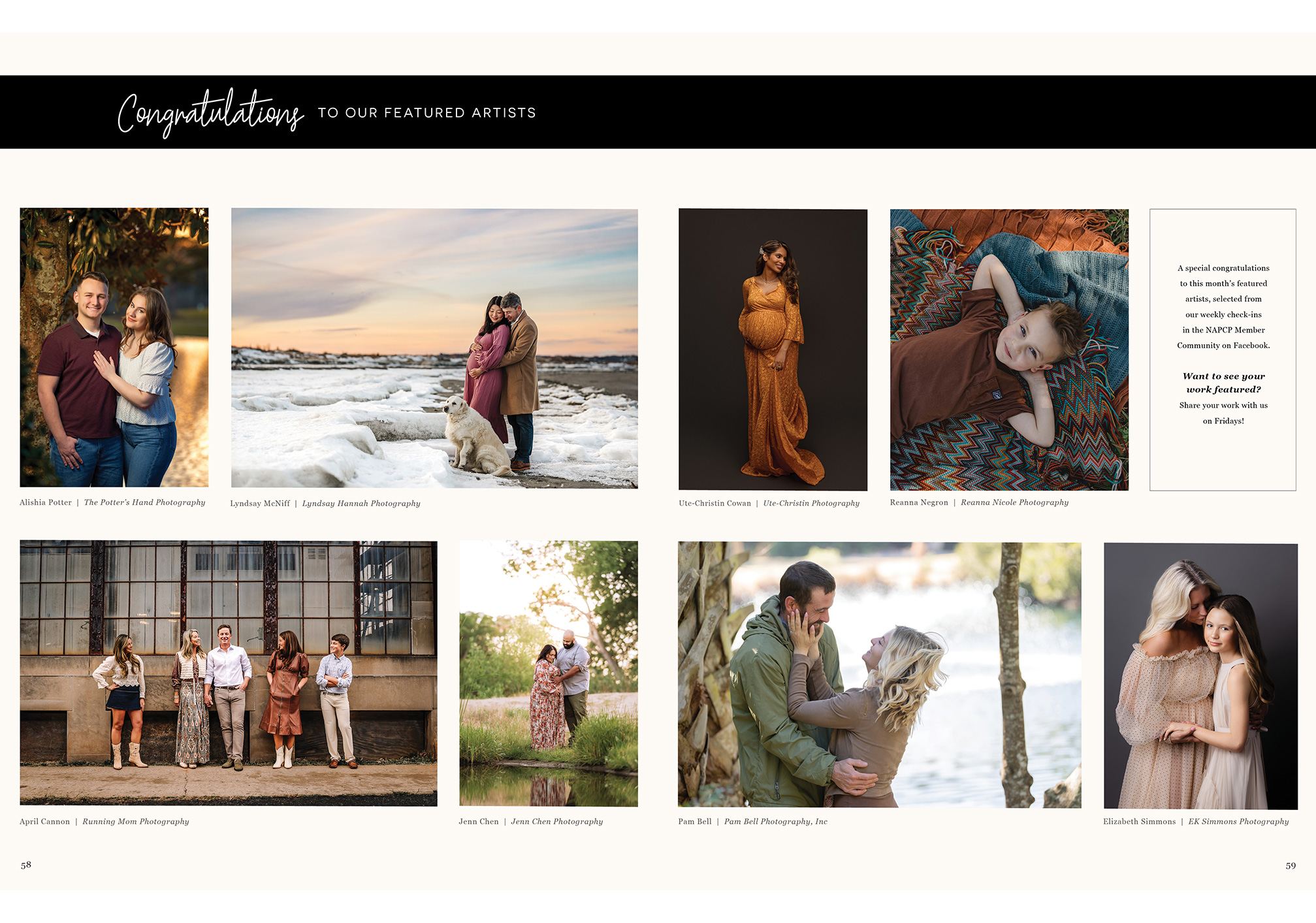 In this issue, we’re excited to look back on a memorable start to the year as we feature highlights from the 2026 NAPCP Gallery Event and Camp Inspired, both of which took place in January. These gatherings were filled with creativity, connection, and meaningful moments that continue to inspire our community. During Camp Inspired, we also had the joy of announcing our 2025 Photographer of the Year. Be sure to look for our June issue, where we’ll share an exclusive interview with Julie Hamlin.