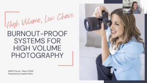 In this NAPCP Social recap, Heather Bienz shares how to create a high-volume photography workflow that is streamlined, organized, and sustainable. She covers the full process from prep to delivery, the systems that help photographers stay efficient, and how to grow without burning out.